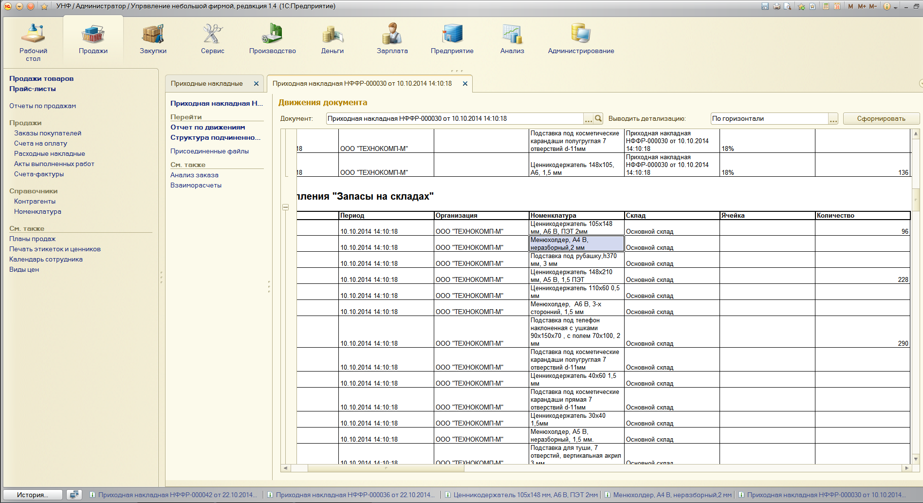 при создании приходной накладной товары через один попадают на склад - в проводках не ставит количество.
