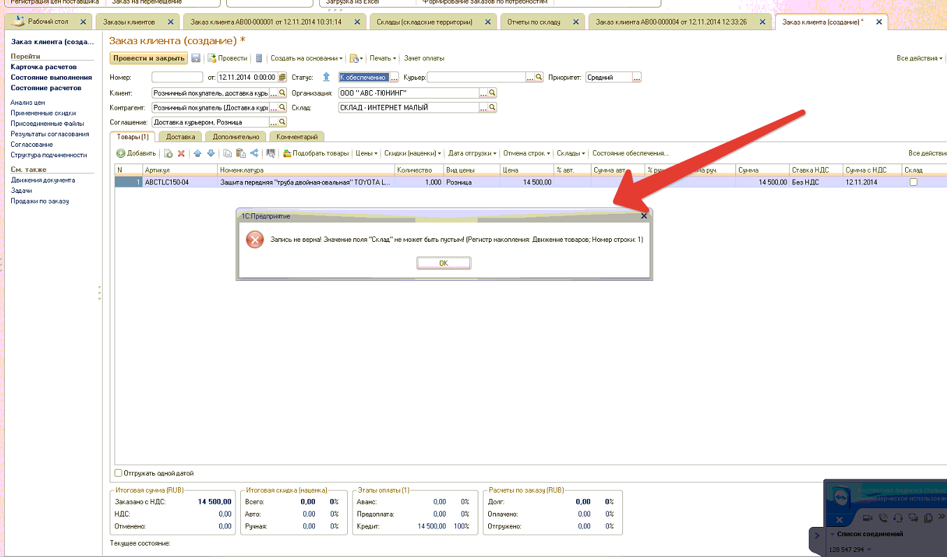 1) При выборе клиента в заказе клиента заполняются различные реквизиты на форме, в том числе и склад. При проведении документа - ошибка. При перевыборе склада ошибка исчезает.