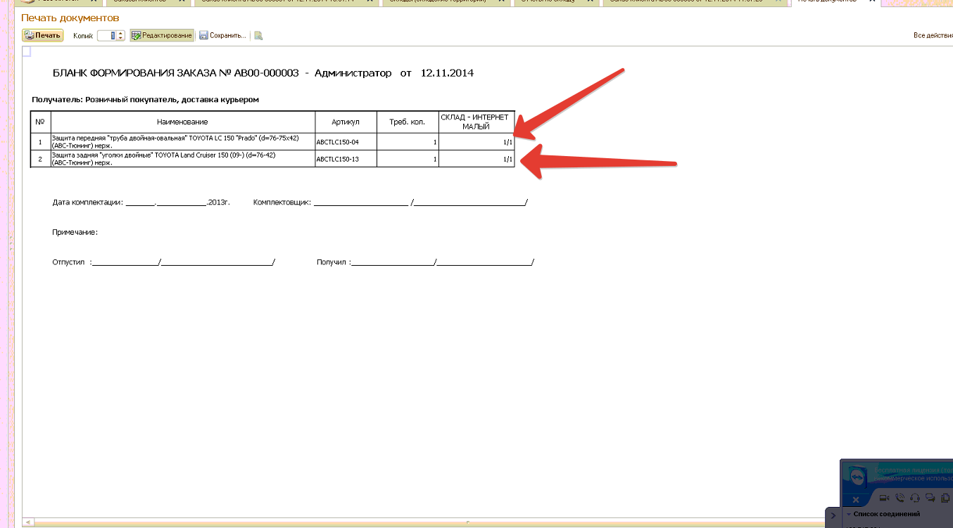 3) Поправить печатную форму заказа клиента ("бланк заказа"). В колонке не верно выводится количество. Не учитывается резервы, состояние отгрузки и т.д. Нужно только реально доступное количество. (скрин)