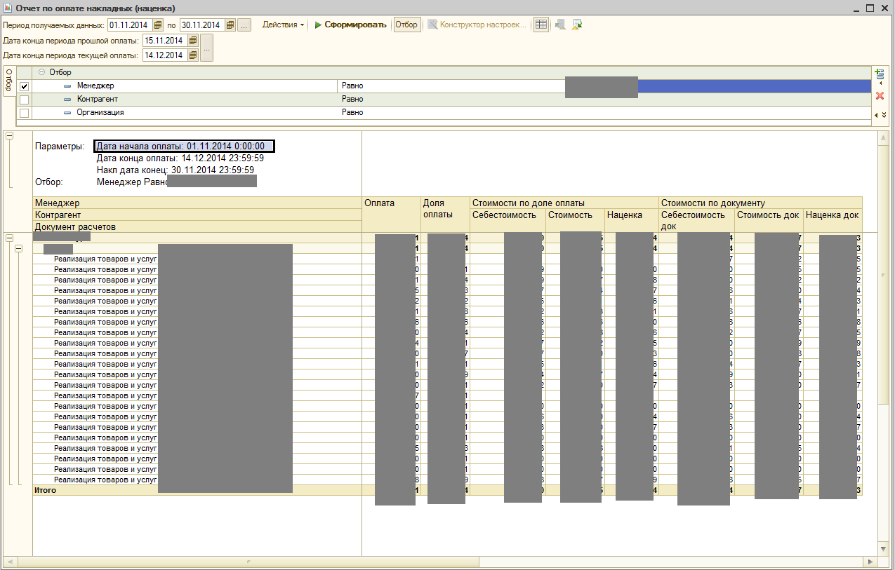 Отчёт имеет два периода (уже реализованно). Первый это интервал принимаемых оплат (за отчётный месяц и 15 дней месяца следующего за ним), второй это интервал накладных (за отчётный месяц). Т.е. в отчёт попадают оплаты за отчётный месяц по всем накладным; и оплаты за последующие 15 дней, но только по накладным отчётного месяца.