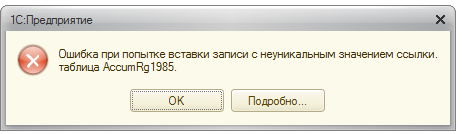 Нужна помощь. "Ошибка при попытке вставки записи с неуникальным значением ссылки. Таблица AccumRg1985"