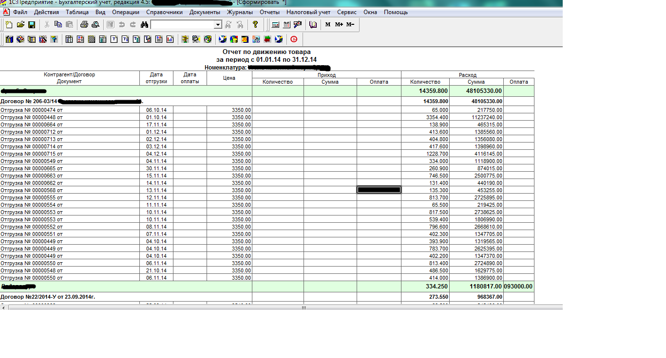1 отчет. При выборе Контрагента, выводятся Договора и движения номенклатуры по ним. Есть возможность выбора дополнительно Номенклатуры.