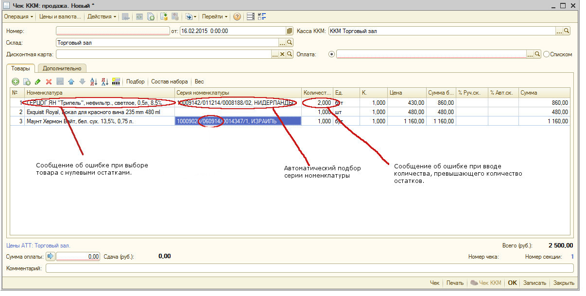 1. при выборе товара (вручную или сканером ШК) с нулевым или отрицательным остатком выводить сообщение об ошибке.
