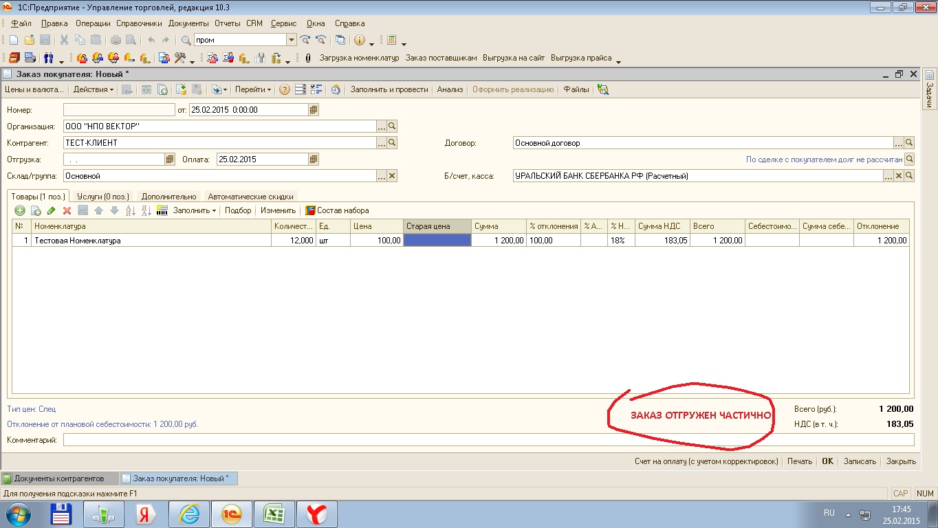 Если заказ отгружен частично - то должна быть надпись: ЗАКАЗ ОТГРУЖЕН ЧАСТИЧНО