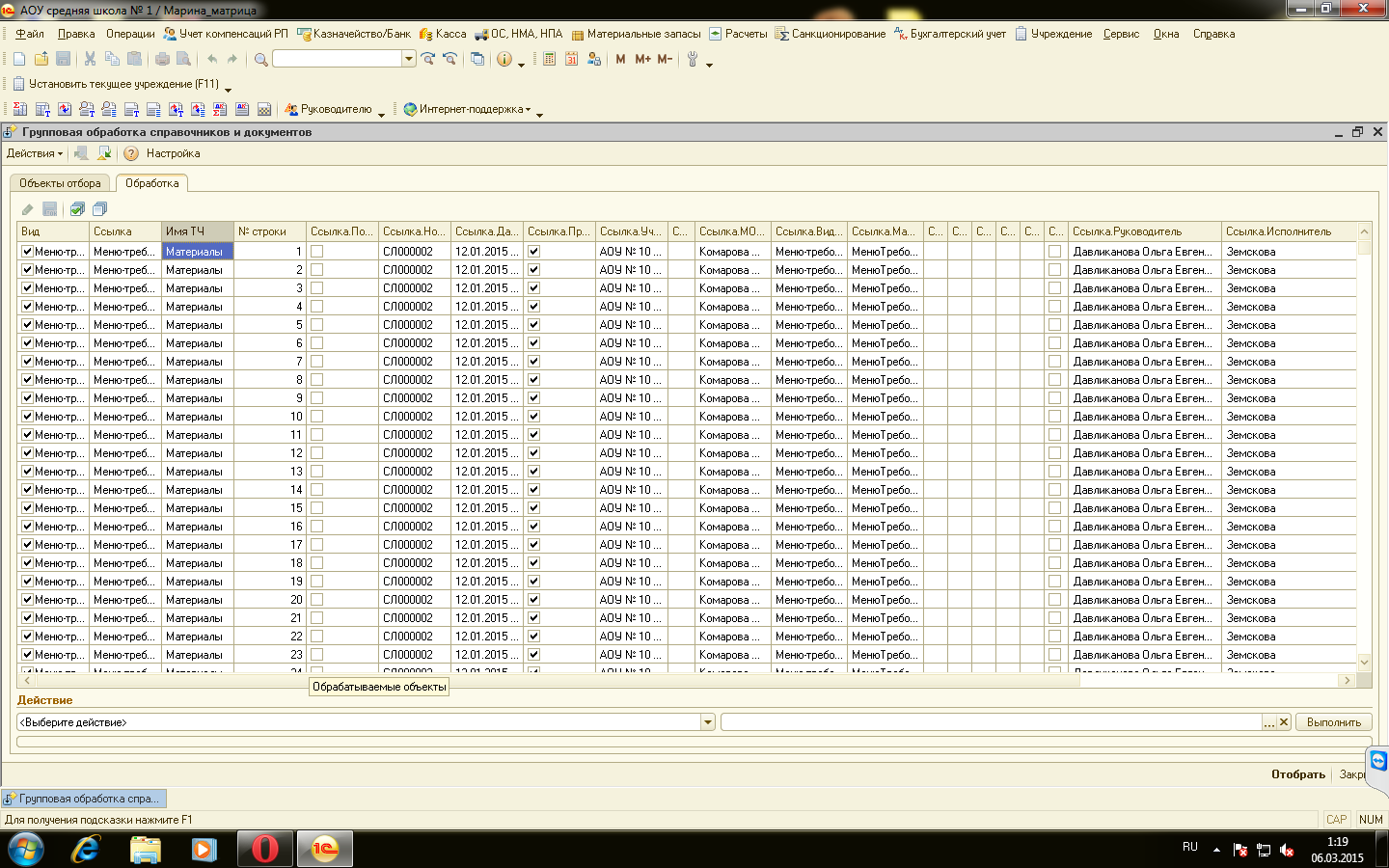 Групповая обработка - с галочками и без Выбираю документ "Меню требование" отбора по КПС и счету нет (скрин).