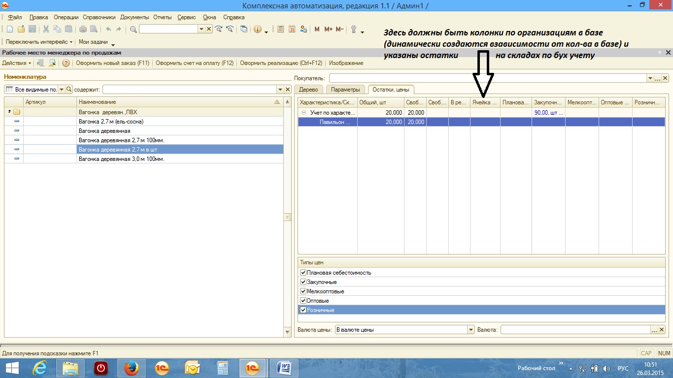 На вкладке Остатки и цены, должны быть добавлены динамические колонки с наименованием организаций в которых отображаются остатки по складам по организациям (данные берутся из бухгалтерского учета).