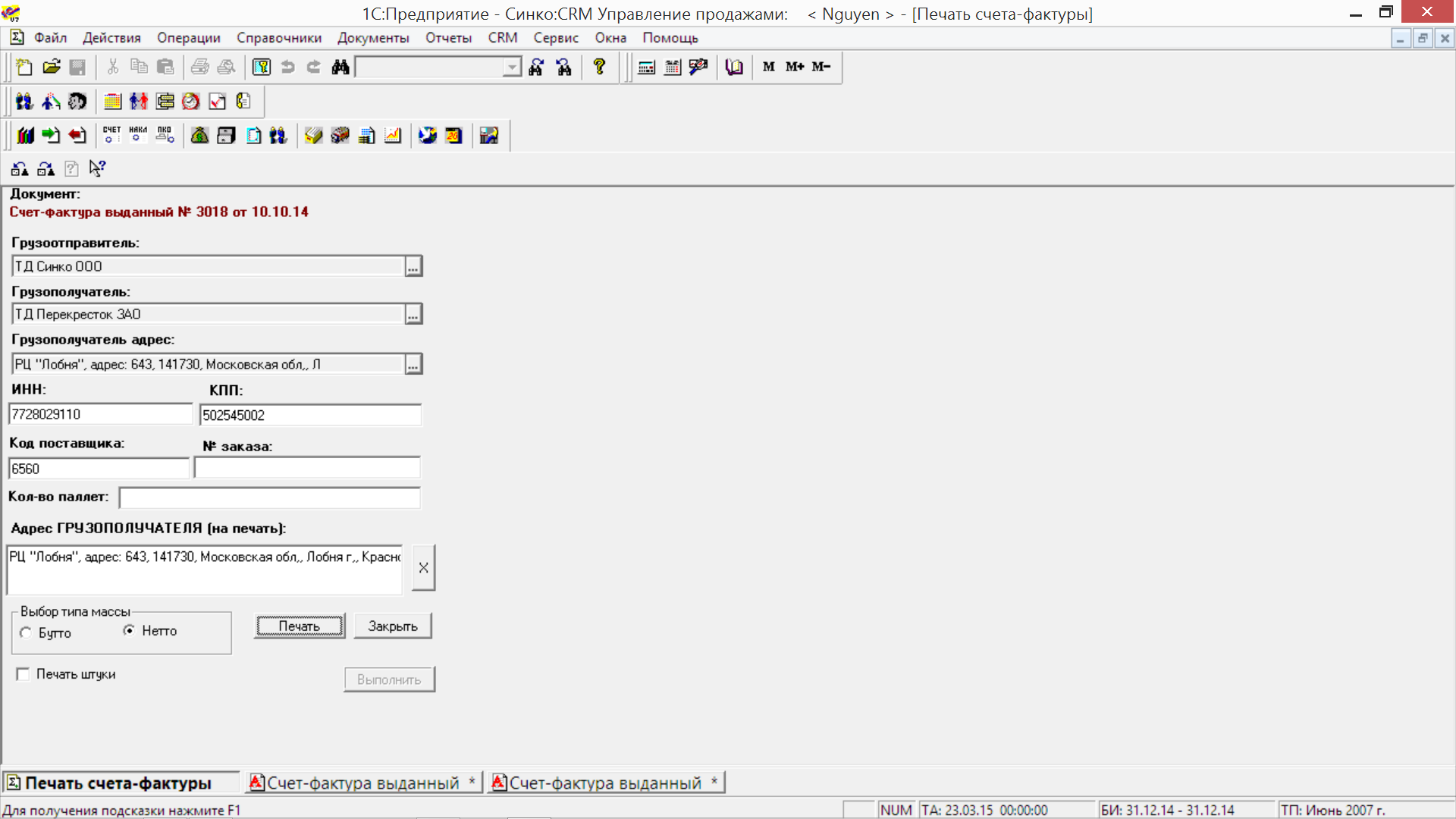 - "Выбор типа массы" - если ""нетто" то в "наименование товара" таб. части заполняется из справ. номенклатуры ( наименование для печати) , тут заранее забито вес нетто( 0,280 кг) в названии ( см. файл СФ "...280 гр. х...."). Если "брутто" то вместо "280" ставится "320" т.е. вес брутто(0,320 кг) базовой ед. из наборы упаковок" данной номенклатуры.