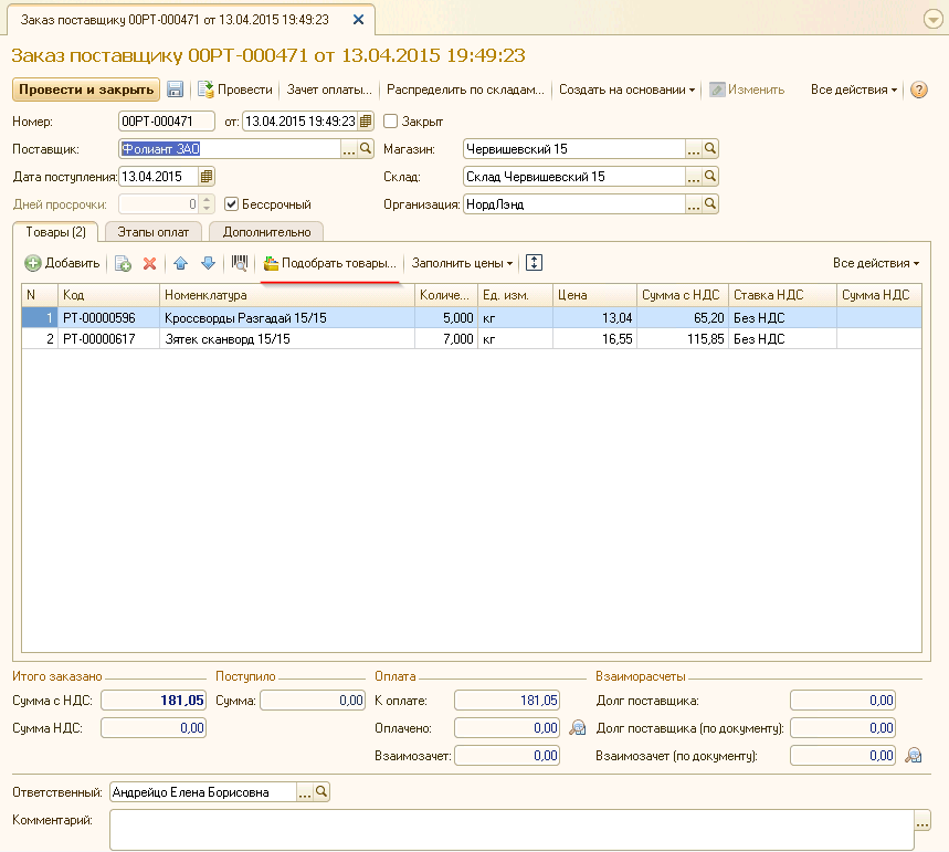 Доработать форму подбора в "Заказе поставщику" УТ11