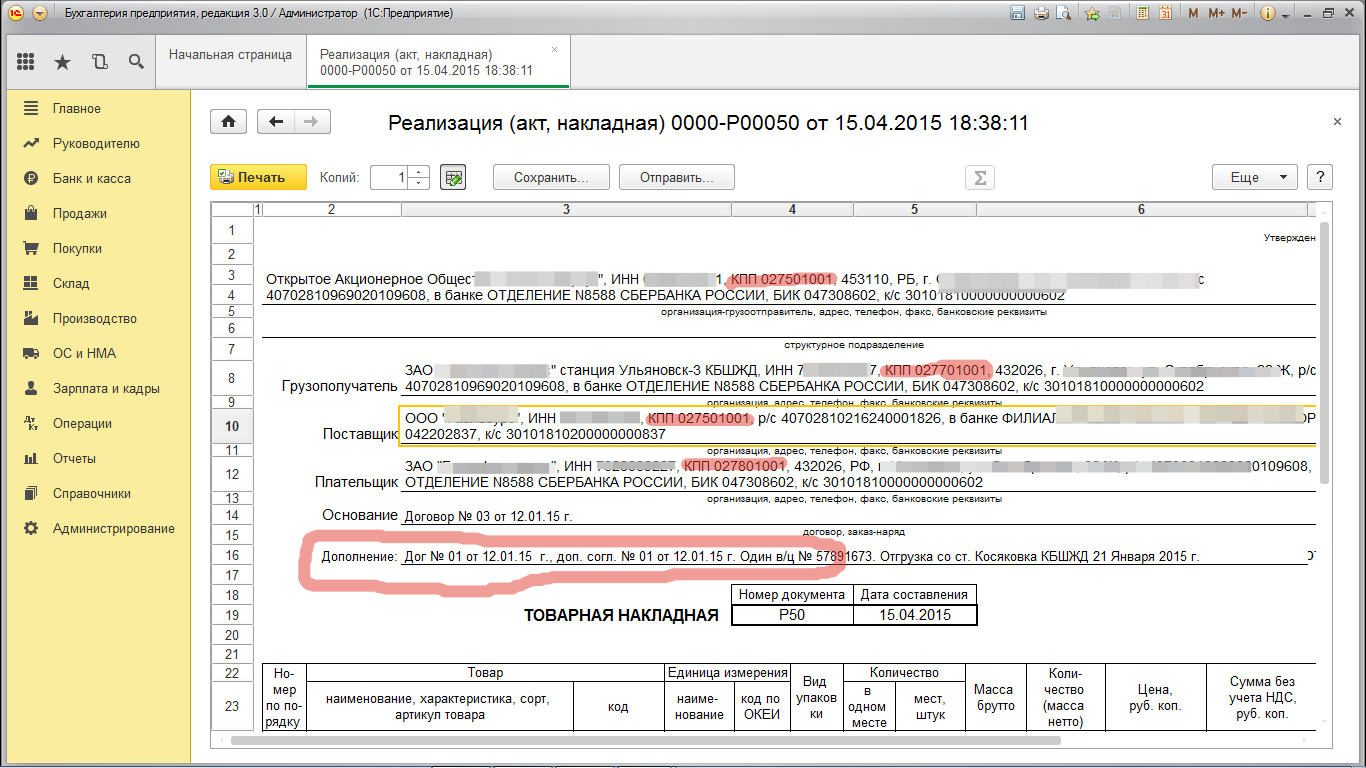 Для Торг-12 - вывести "Дополнение" + текст из реквизита "Комментарий", для всех Контрагентов шапки вывести КПП.