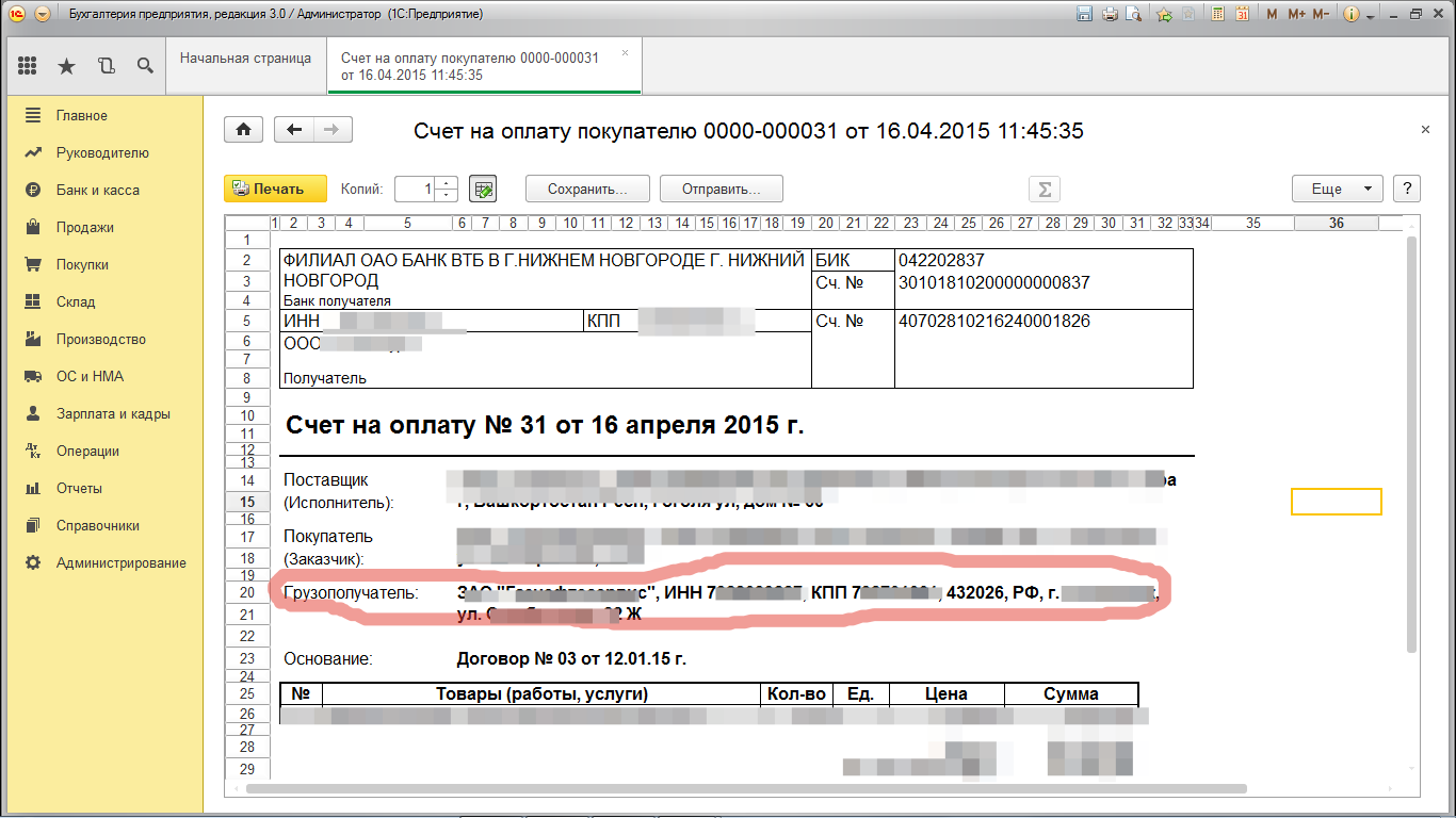 Для Счета - При печати запросить Грузополучателя и вывести его реквизиты в печатную форму.