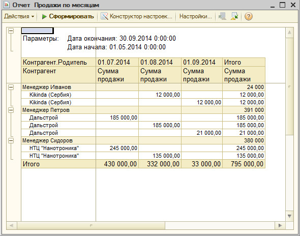 Необходим внешний отчет по продажам менеджеров за произвольный период. Контрагенты собраны в папки с фамилиями менеджеров. Форма отчета в прикрепленном файле.