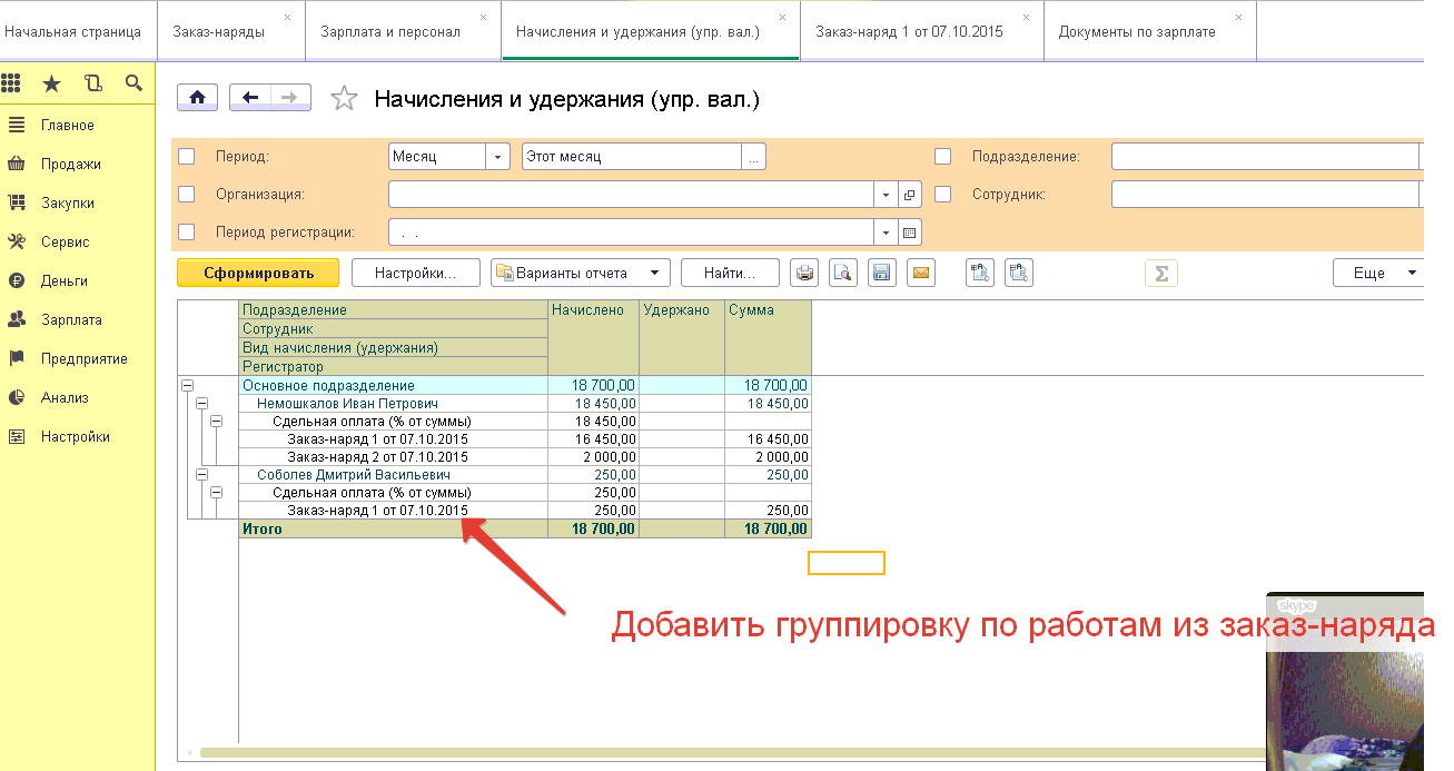 Нужно добавить группировку по работам в отчете "Начисления и удержания".