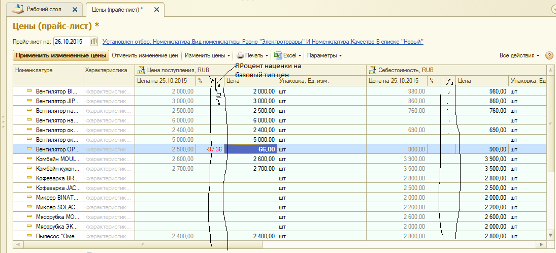 Добавляем колоночку % как в рисунке и при изменении этого процента находим в текущей строке цену базового типа цен, по которой рассчитывается текущий вид цен. Базовая цена не действующая (из установки цен), а из строки (возможно еще не примененная), т.е. новая