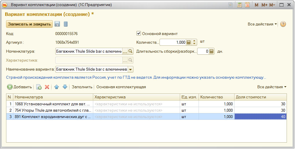 загрузка данных из excel в справочник "Варианты комплектации номенклатуры"