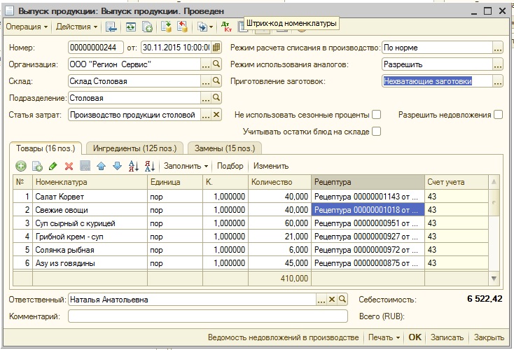 - табличные части "Ингредиенты" и "Замены" необходимо заполнить по стандартному алгоритму (как если бы они заполнялись при ручном заведении документа)
