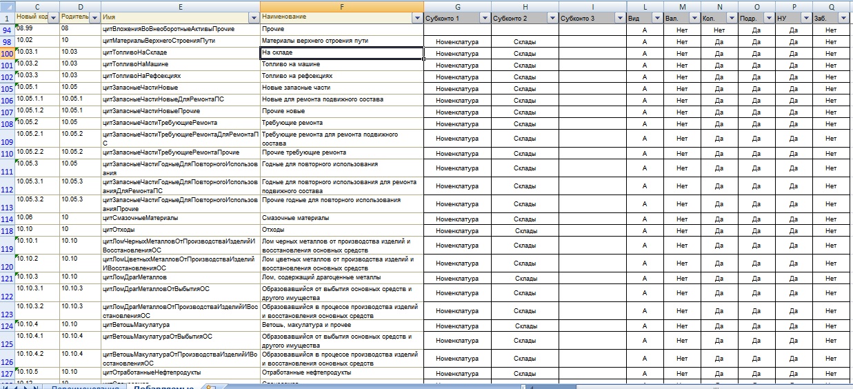 1. Изменить коды/наименования 191 существующего счета согласно таблице Excel.
