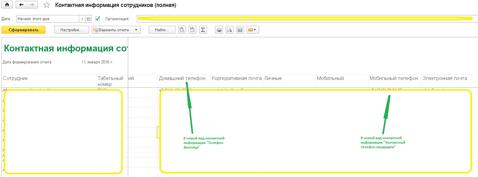 Выбираем вид текущий и новый и нажимаем кнопку "Перенести". Заходим в карточку физлица и видим личные данные, в которых телефон имел одно название, а стало другое. Планируется изменение только для типов - телефон, так как перенос данных из ЗУП 2.5 выполнился на некорректный вид контактной информации