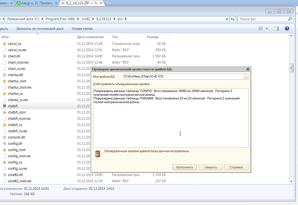 Типовая бухгалтерия 2.0.64.30 обновлялась на 2.0.65.7, платформа 8.2.19.121. При обновлении произошел сбой. База не открывалась(не копировалась - скорее всего лежала с bed кластером- это было не внешнем жестком диске) chekdisk ошибки не внешнем жестком диске исправил, базу удалось скопировать, но она(файл будет отдан Вам на лечение) не запускалась. После лечения стандартной chdbfl (скриншот1) файл базы уменьшился в размере, но зарускаться в работу (да и в конфигуратор) не хочет - дает ошибку "Ошибка считывания вторичной информации" (скриншот1). Копии к сожалению никакой нет (база новая ведется только с октября 2015).