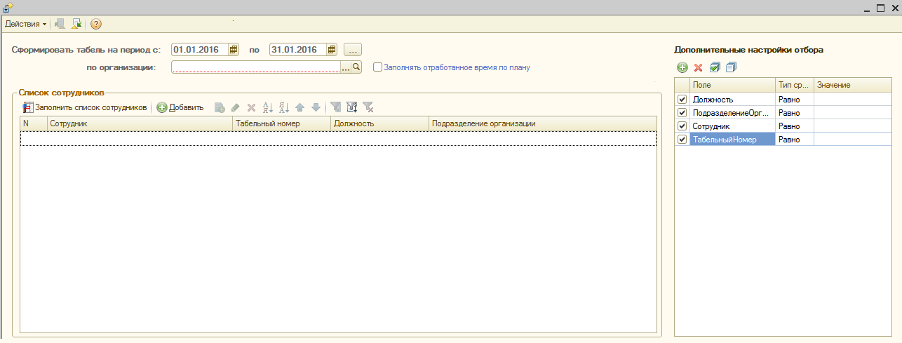 Справа должна быть табличная часть с отбором. Такие как: Должность, подразделении, Сотрудник, Табельный номер. И при нажатии на кнопку "Заполнить список сотрудников" этот отбор должен учитываться.