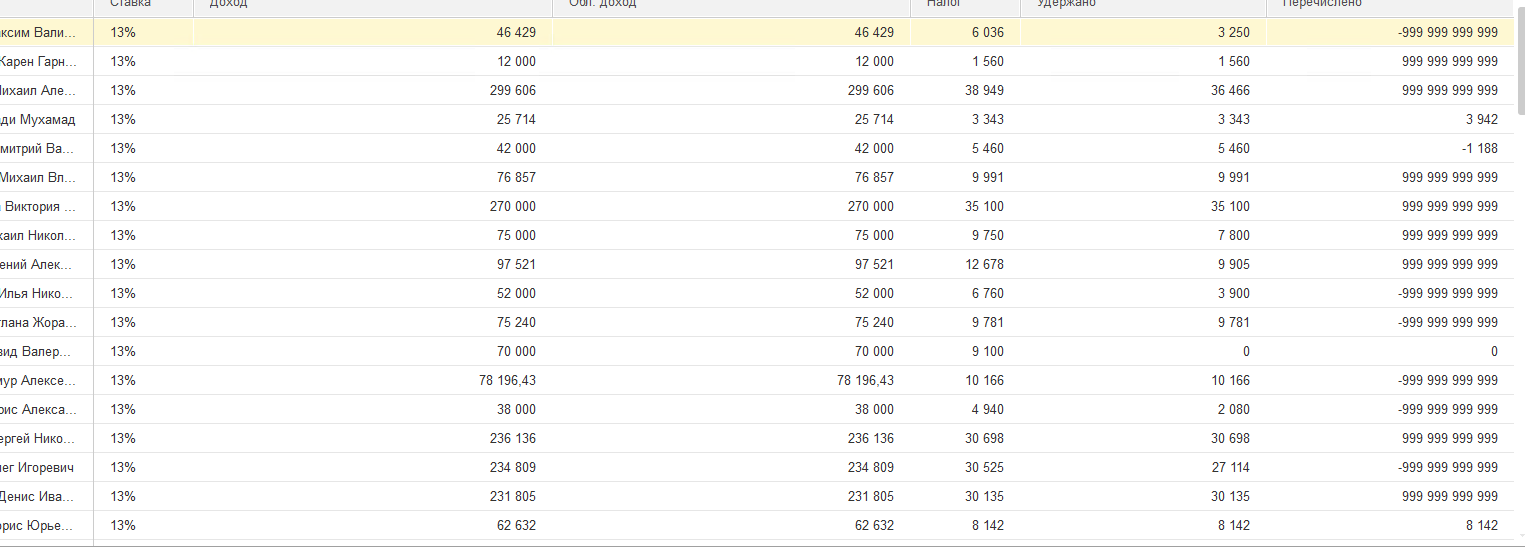 Требуется срочно разобраться, почему в 2 НДФЛ для передачи в налоговую, в графе Перечислено, указаны нереальные суммы 999 999 999 999. У всех сотрудников, кроме двоих или троих.