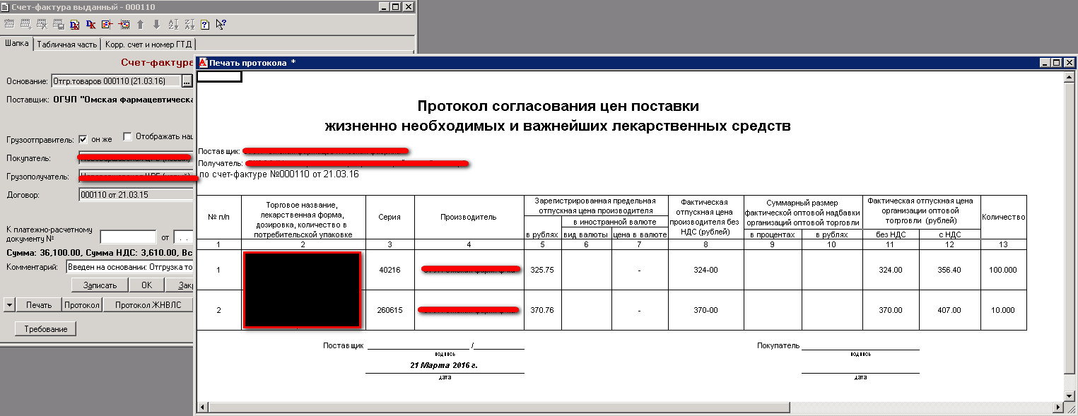 Необходимо для СФ сделать внешнюю печатную форму "Протокол согласования цен поставки лекарственных препаратов, включенных в перечень жизненно необходимых и важнейших лекарственных препаратов" по образцу.
