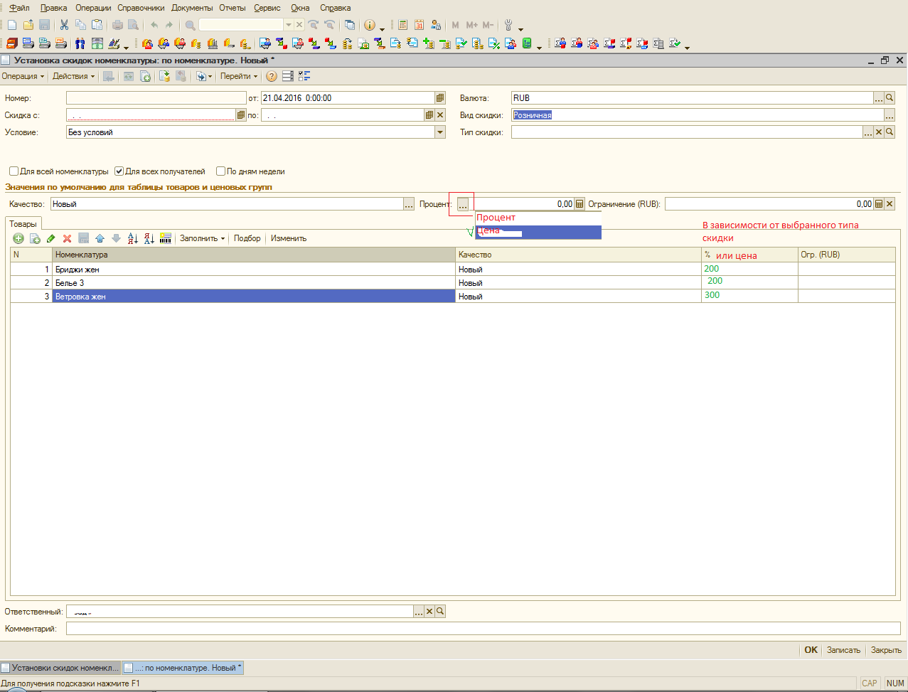 Затем вводится еще один док "установка скидок", согласно которому в дни d-e вся номенклатура будет распродаваться по цене 100 руб. Как только заканчивается день e, новый документ установки скидок не вводится, и товар опять начинает продаваться по базовому прайсу: юбка - 500 руб; свитер - 400 руб.