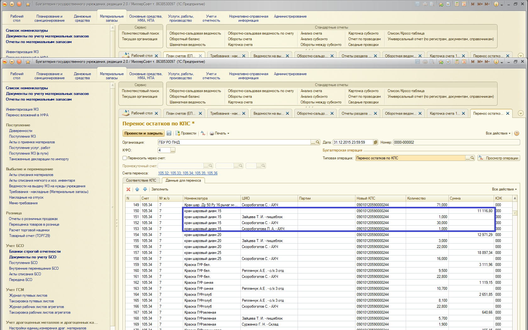 Стандартный документ "Перенос остатков по КПС" не переносит суммы по ЦМО (например на рис.3 по номенклатуре "кран шаровый" по ЦМО переносится только количество, а сумма переносится по номенклатуре в целом без учета ЦМО. Т.е. остатки по ЦМО вводились правильно - по количеству и сумме по ЦМО (на рис.4 - документ "Ввод начальных остатков"), а документ "Перенос остатков по КПС" суммы по ЦМО не переносит.