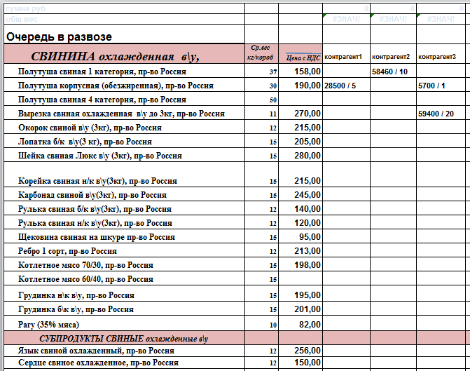 Структура данных: левый столбец номенклатура (по группам), рядом столбцы кол-во кг/коробка, цена за кг; верхний ряд контрагенты; в пересекающейся клетке указывается общая цена к оплате и кол-во коробок в заказе.