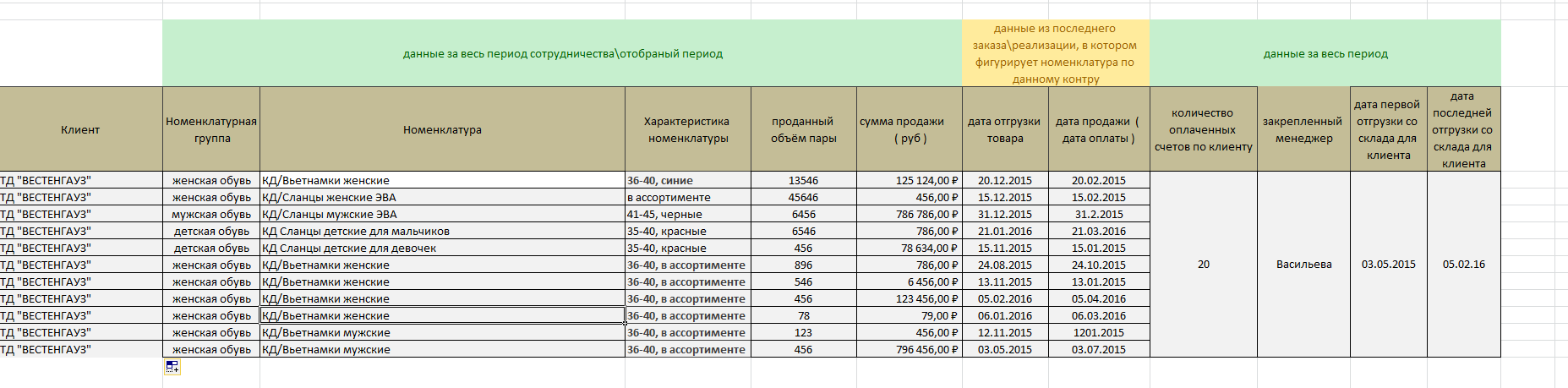 Требуется расширенный отчет по продажам, схематический вид отображен на прилагаемой картинке. Основная суть - вывод по данным заказов информации по каждому клиенту, каждому наименованию из заказов - сколько всего было продано, даты первых и последних закупок и т.д.