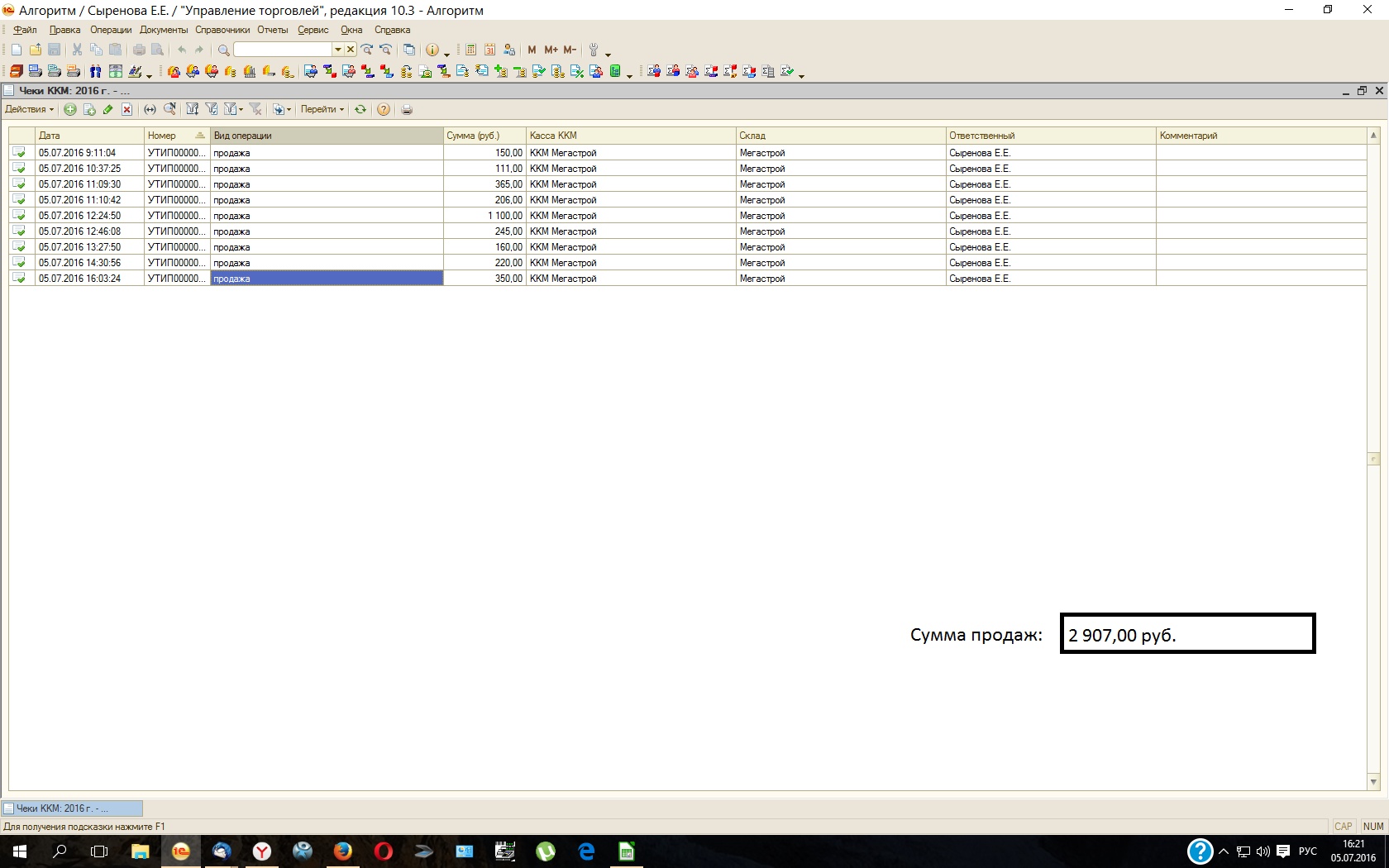В форме списка документа Чек ККМ добавить поле, куда выводить общую сумму по всем чекам ККМ не находящимся в архиве. Т.е. по чекам в сегодняшней смене. В общем просто суммируем все чеки на экране.