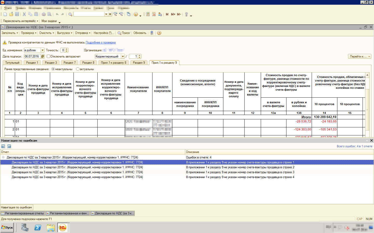 Ругается на то что не указан номер счета - фактуры в разделе 9 Прил. 1