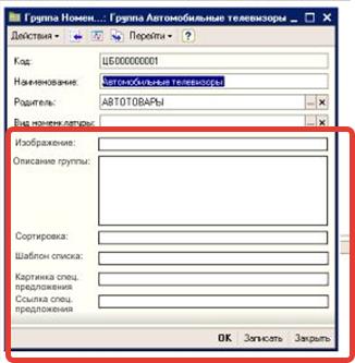 - Изображение - иконка группы товаров. Возможность прикрепить jpeg, gif, png картинку.