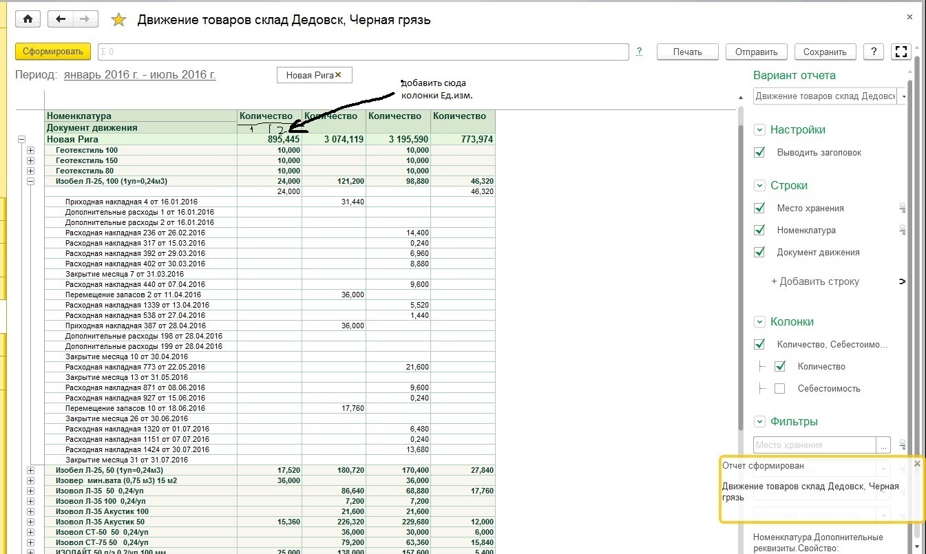 Нужно переделать отчет так чтобы в нем выводились колонки ВСЕХ единиц измерения относящиеся к номенкатуре. (Мы принимаем товар в одной единице, храним в другой)