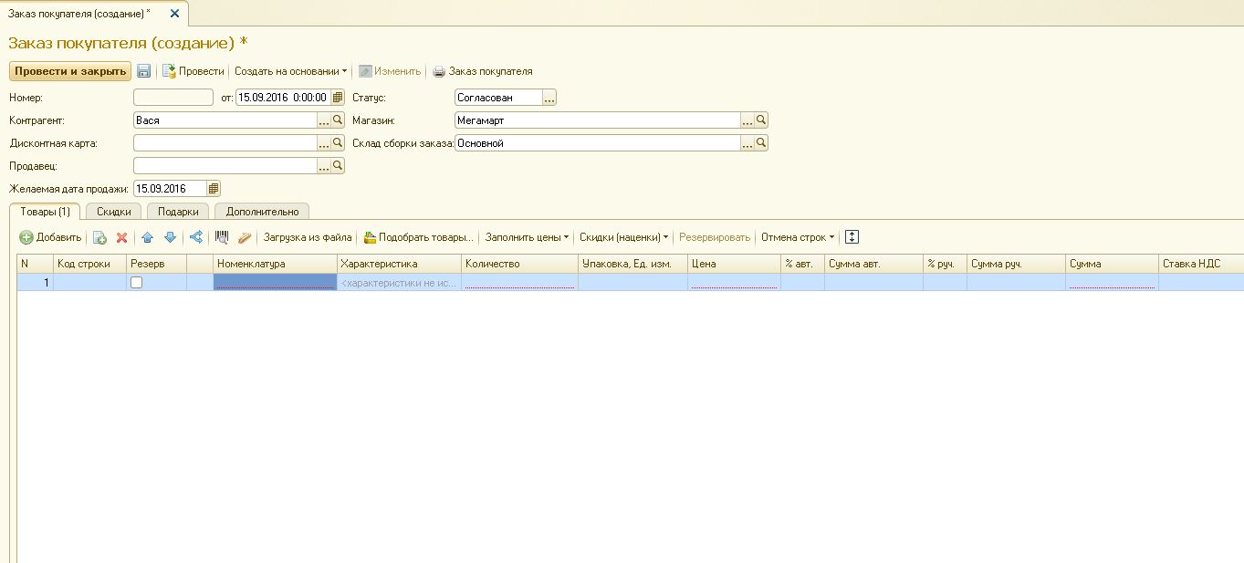 Требуется обработка, которая будет создавать документ "Заказ Покупателя"