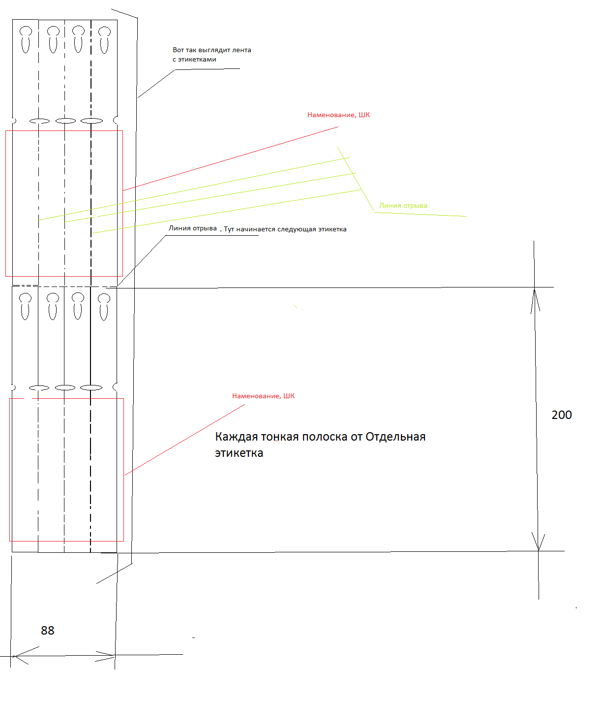 Одна этикетка представляет собой 4 узкие этикетки (отрывные). Каждая узкая этикетка должна выступать ОТДЕЛЬНОЙ этикеткой, содержащая Наименование номенклатуры и Штрихкод.. Принтер должен напечатать одную широкую этикетку , содержащую 4 этикетки номенклатуры (каждая большая этикетка - это всего лишь секция из 4 этикеток)