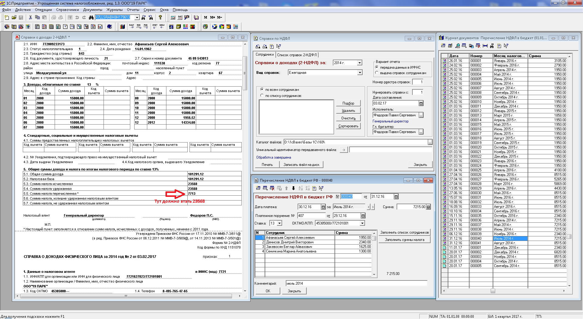 Во вложении скрин и более подробно опишу ситуацию: в 2014 году бухгалтер начисляла и выплачивала з/п работникам и перечисляла соответственно НДФЛ в бюджет с выплаченных сумм. Так продолжалось до марта 2014 года. С апреля 2014 года зп только начислялась, но не выплачивалась и, соответственно, НДФЛ не перечислялся в бюджет. В 2016 году организация перешла под руководство другому диру и буху. Начали гасить задолженность по зп. Т.е. выплачивать зп за апрель-декабрь 2014 года и перечислять НДФЛ за 2014 год в бюджет. Все, всем выплатили за 14 год, по суммам с налоговой сверились, за 14 год больше ни чего не должны. Но вот справки формирует черти как. В справках показаны только суммы перечисленного НДФЛ с января по март 2014 года т.е. за тот период, когда зп платилась вовремя. Может в момент, когда я провожу документ перечисления НДФЛ надо как-то иначе его проводить в случае если этот налог за прошлый период?
