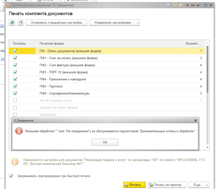 Исправить ошибку в УТ при печати комплекта