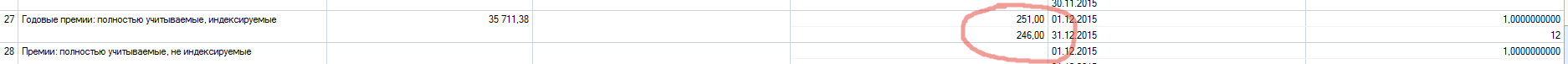 2. "Отработано за расчетный период", "Норма дней за расчетный период" - если в расчетном периоде есть годовая премия(сумму премии выводит, а дни-нет)