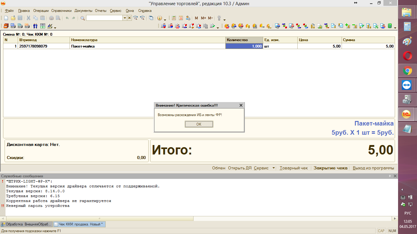 Необходимо подключить ШТРИХ-LIGHT-ФР-К к 1С: УТ 10.3. УТ с небольшими доработками, последний релиз. Подключил через USB, драйвер установил, в 1С в торговое оборудование подключил. Когда в 1С закрывается чек, пишет ошибку и чек не печатает.
