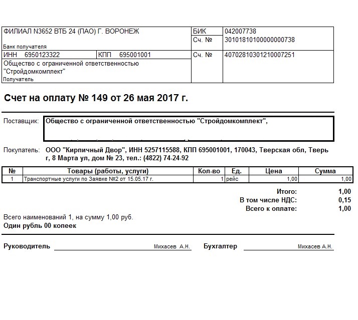 5. Сделать так, чтобы в 1С при выставлении Счета на кирпичные изделия выводился "Счет-договор на оплату" (как сейчас у нас), а если мы выставляем Счет на транспортные услуги, то это "Счет на оплату", и, соответственно, в нем нет текста договора и верхушки, где написано «Внимание! Оплата……». Ниже два вида Счета (на кирпич и на транспортные услуги (как должно быть)).