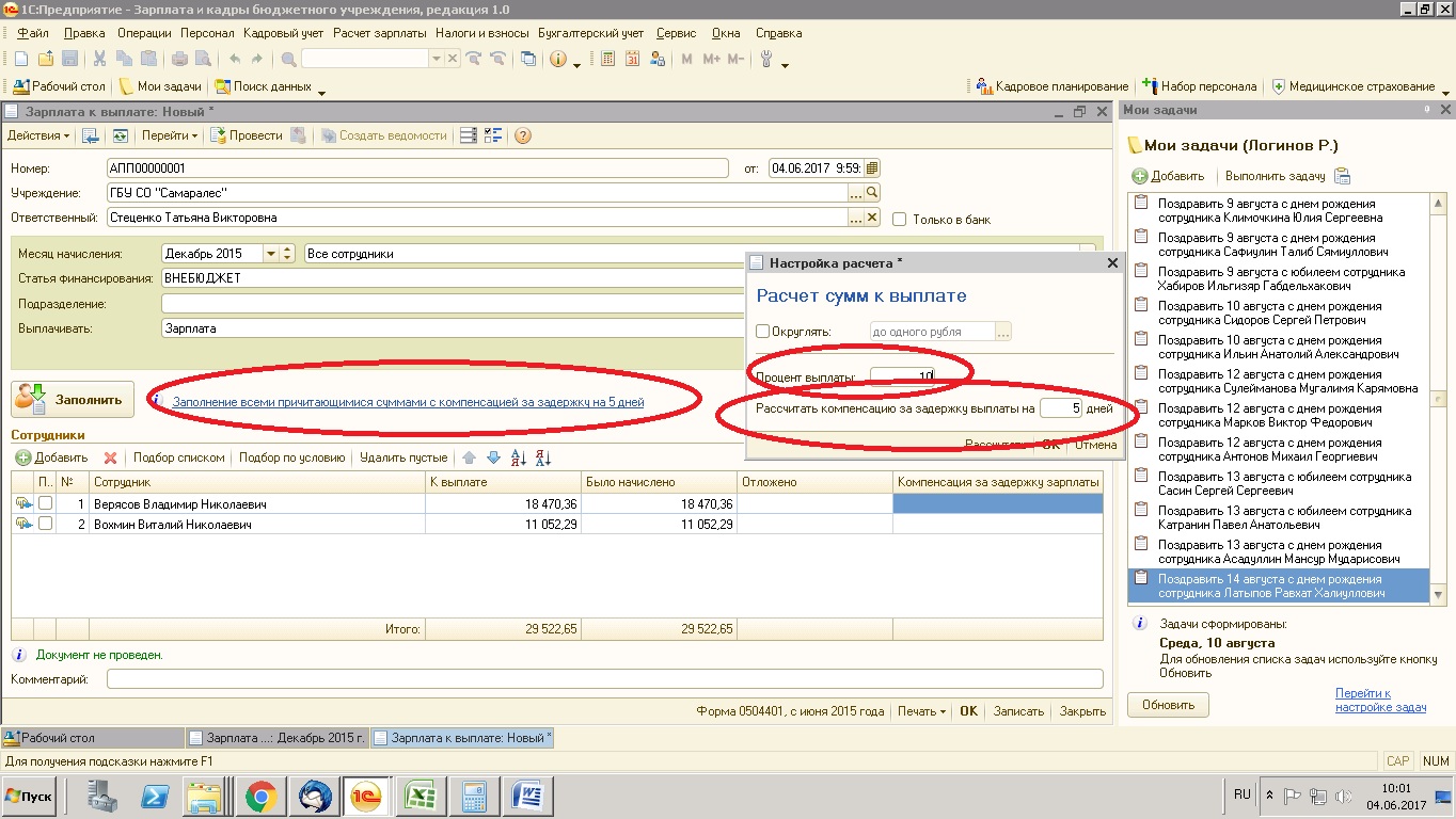 если пользователь заходит в строку "заполнение всеми причитающимися суммами" при установке там процента выплаты и дней компенсации и нажатии на "рассчитать" - должен произойти не штатный перерасчет, а просто взяться процент от заполненных в табличной части сумм. В нашем примере если поставим 10% - в табличной части должны остаться суммы у Верясова 1847,04, у Вохмина 1105,23.