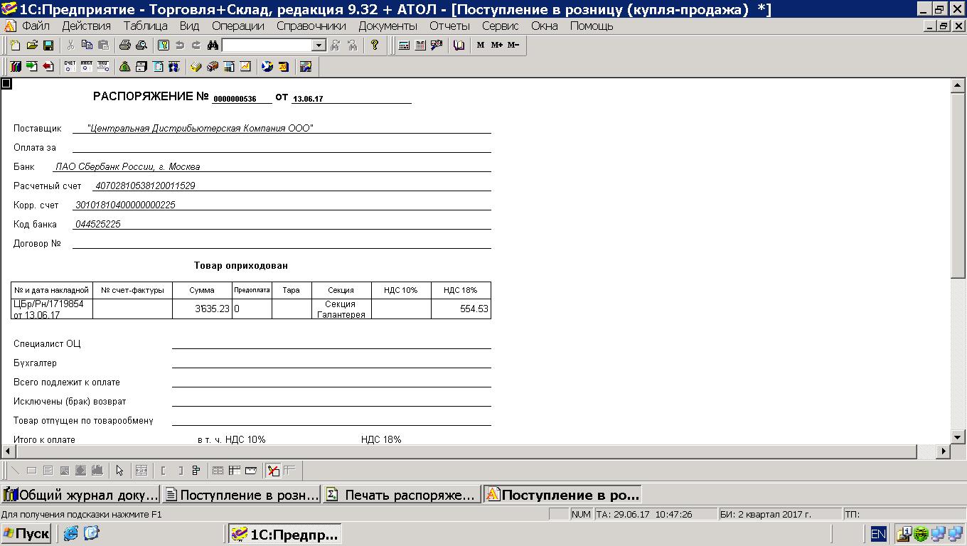 на основании приходной накладной создается документ "распоряжение" имеет следующий вид(это из 1с7)