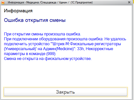 Текст ошибки: При открытии смены произошла ошибка. При подключении смены произошла ошибка: Не удалось подключить устройство "Штрих-М Фискальные регистраторы": 33h, Некорректные параметры в команде (999). Смена не открыта на фискальном устройстве.