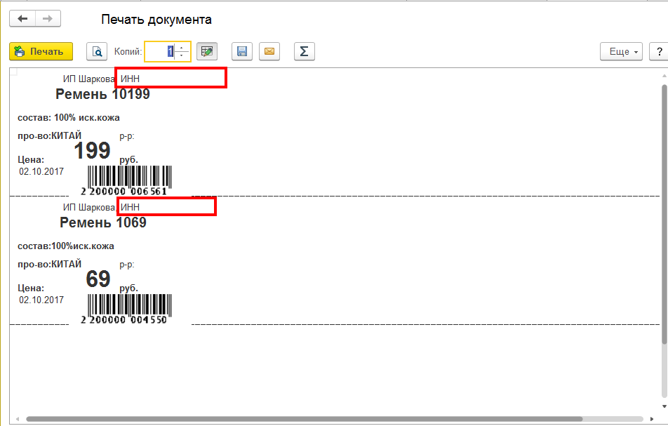 Есть небольшая работа в 1С Розница 2.2: после обновления программы до релиза 2.2.6.33 в ценниках перестал печататься ИНН. Ценники печатают из документа "Поступление товара" кнопка "Печать"Ценники Ссылка на базу http://dropmefiles.com/NBMLr пользователь Администратор без пароля
