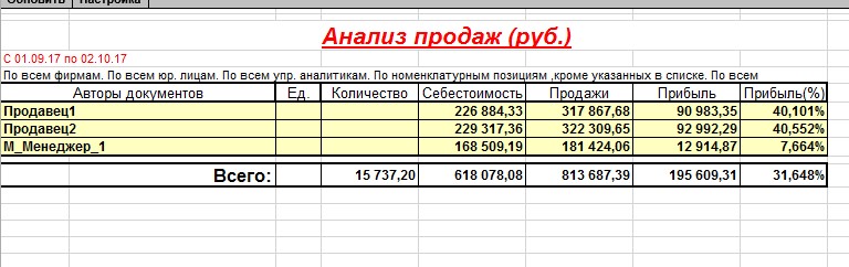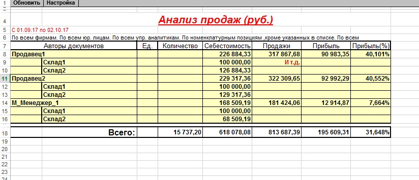 В итоге отчет должен выглядеть так, как на скрине3 (продажи по авторам документов вразбивку по складам).