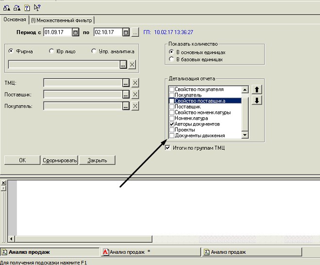 Отчет формируется с заранее заданными в множественном фильтре настройками. (есть в тестовой базе)