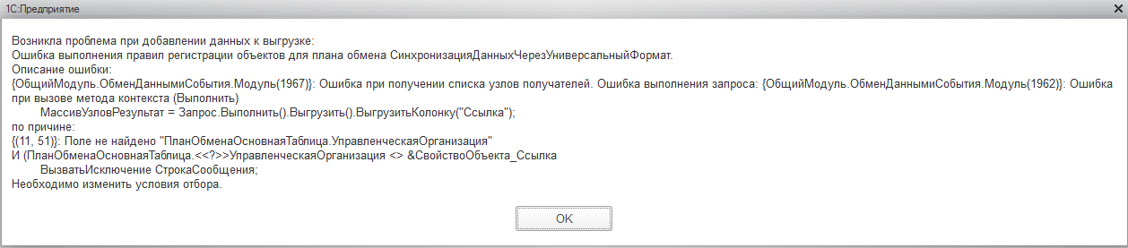 "Поле не найдено "ПланОбменаОсновнаяТаблица.УправленческаяОрганизация...".