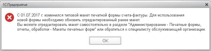 Выводится сообщение: "С 01.07.2017 г изменился типовой макет печатной формы счета-фактуры. Для использования новой формы необходимо обновить отредактированный ранее макет.