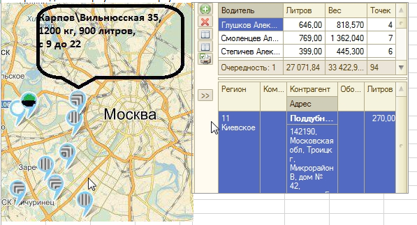 В настоящее время есть собственная доработка для планирования развоза водителей: в окне Список с заказами и Список с водителями. Каждый заказ соответственно прикрепляется к водителю.