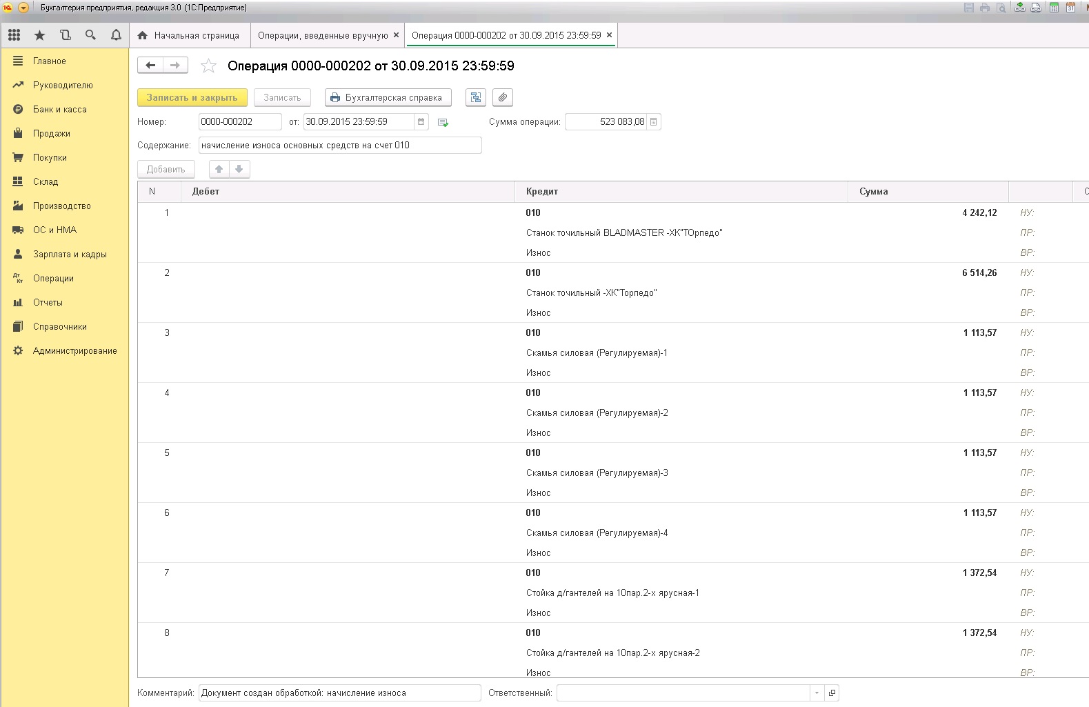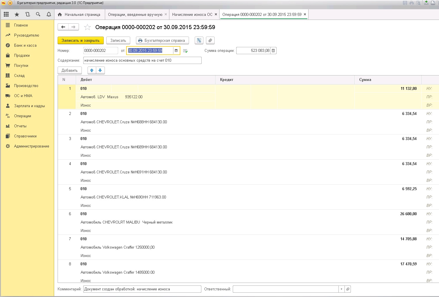 Бухгалтерия предприятия, редакция 3.0 (3.0.52.42). Существует операция введенная вручную, созданная обработкой. В данной операции заполняется амортизация по основным средствам на 010 счет на кредит. Нужно перенести все с кредита на дебет. Принт-скрины того чего есть и то что хотелось бы увидеть прилагаю.